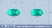 무색 투명한 액상의 내용물을 함유한 연청록색의 볼록한 타원형 연질캡슐